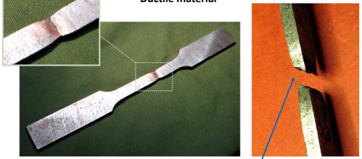 Ductile materials fracture after necking (yielding), while brittle materials will suddenly snap with an uneven pattern (snapping). Brittle: