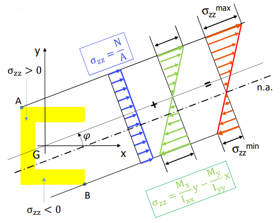 In a generic point of the beam, we simultaneously have Normal Stresses () and Shear Stresses (). To check for failure, we must combine these into an equivalent “Ideal Stress”.
