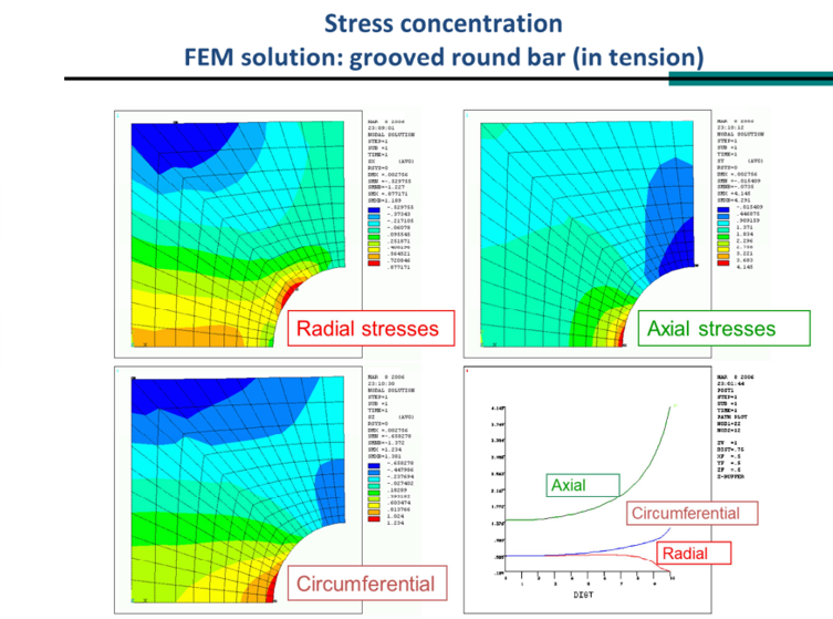 - Visual Evidence: The FEM solution for a grooved bar shows how axial stress peaks at the root of the notch while radial stress develops inside.
