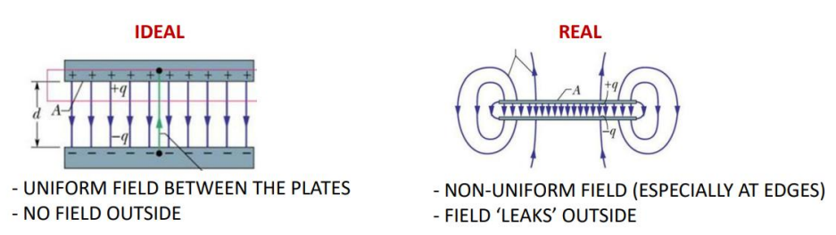 In an ideal capacitor, outside, we have, and between the plates: