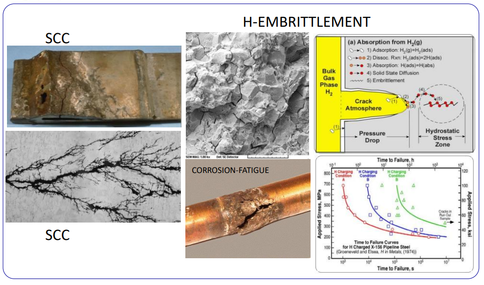 - Effect: Low ductility fracture. Can be confused with SCC, but strictly due to Hydrogen presence preventing plastic deformation (dislocation movement).