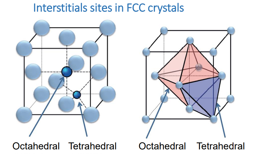 This has applications in metallurgy, such as sin the production of steel. (ferrite) is tightly packed with more interstitial sites, but the slots are smaller, meaning that very little carbon can fit (). However, above , the iron structure changes into the FCC (austenite), which has fewer larger sites. This actually allows for way more carbon to fit in (up to ). By then quenching the material, we can get the structure to readjust to its room temperature BCC formation, while retaining the carbon within it.