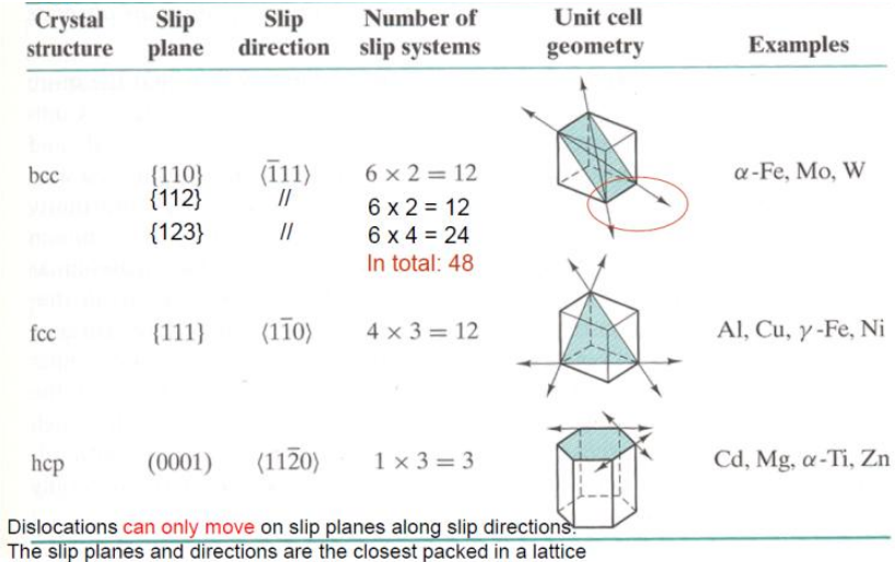 Each structure (FCC, BCC, HCP) has characteristic slip systems. The ductility of the material depends on the number of independent slip systems available. According to the (Taylor) Von Mises Criterion, a polycrystal requires at least 5 independent slip systems to deform arbitrarily without cracking. FCC metals (12 systems) satisfy this and are ductile; HCP metals (often <5 systems) do not, and are often brittle unless they deform by twinning.