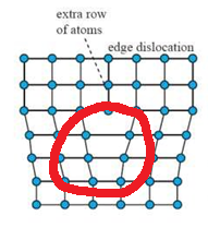 A Cottrell atmosphere is a type of defect that tends to occur most often in steels. It involves an edge dislocation creating space for carbon atoms in the section of the material in tension (Circled in red below).