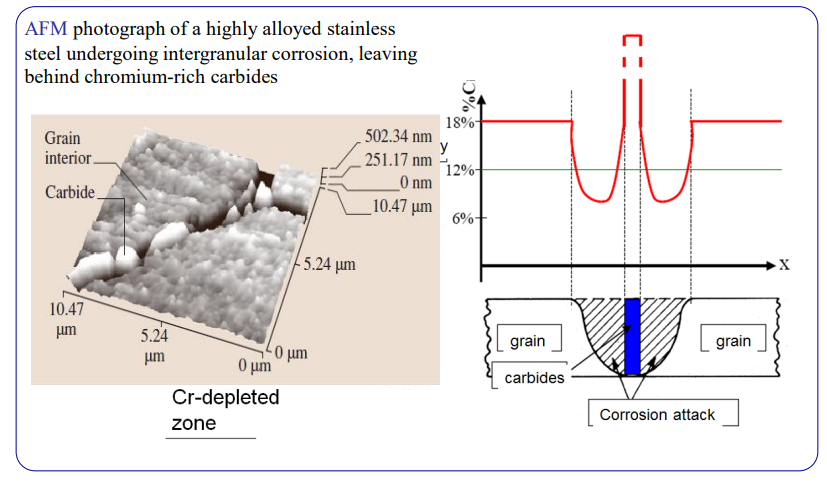 - Result: The grain boundaries are no longer stainless. They corrode rapidly (Intergranular Corrosion).