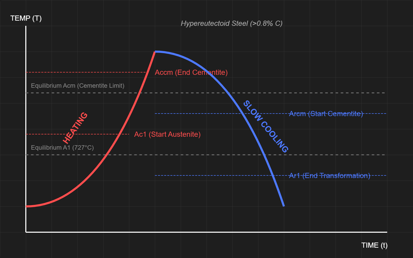 The above diagrams show a time vs temperature diagram of how different forms of steel are created. The first diagram shows hypoeutectoid steel (low carbon), while the second one shows hypereutectoid steel (high carbon)