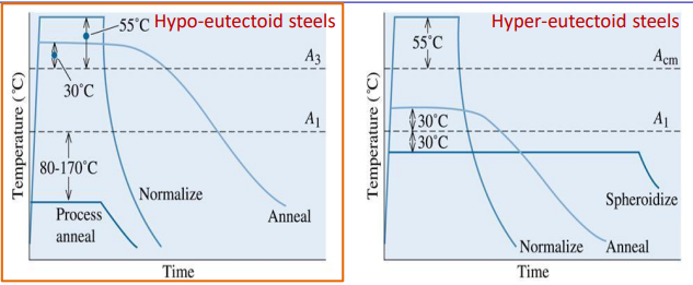 Conventional heat treatments for Hypo- and Hyper-eutectoid steels. The goal is to modify microstructure (Grain size, phase distribution) to alter mechanical properties.