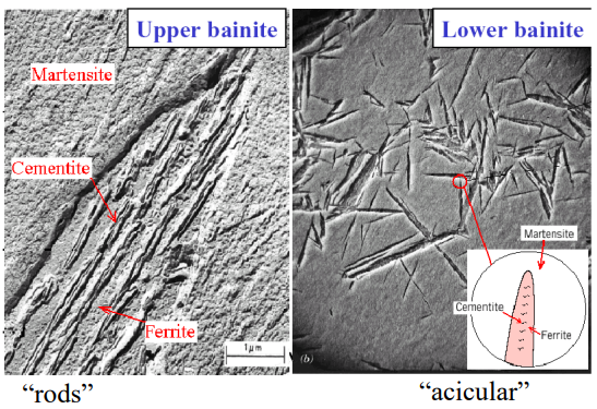 - Lower Bainite (250°C – 400°C): Forms at lower temps. Looks like needles (acicular). The carbides precipitate inside the ferrite needles. High strength and high toughness.