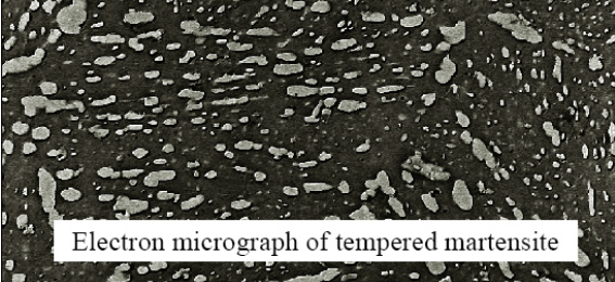 Martensite is extremely hard and brittle. After tempering, the cementite phase turns into spheroidal shapes. The tempering is done at 250-650 °C. This reduces internal stresses and increases toughness.