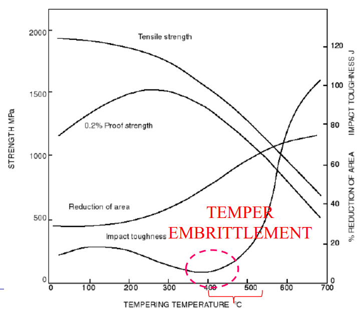 Normally, tempering increases toughness (). However, if you hold the steel in the 400°C – 550°C range (or cool slowly through it), the toughness drops dramatically.